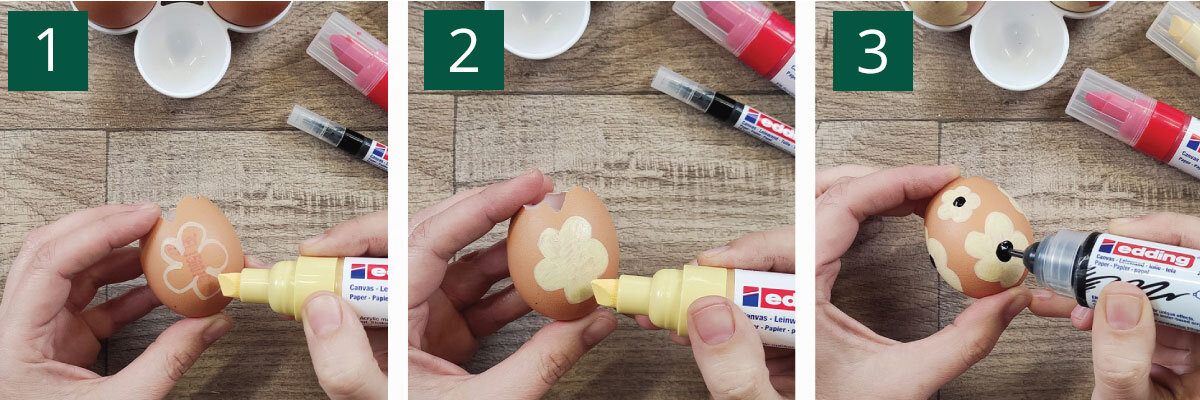 1. Πλένουμε εξωτερικά τα αυγά τα σπάμε περίπου στη μέση και τα αδειάζουμε προσεκτικά. Σχεδιάζουμε ένα περίγραμμα λουλουδιού με τον μαρκαδόρο edding 5000.