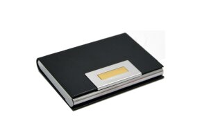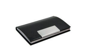 Θήκη επαγγελματικών κάρτων απο μαύρη δερματίνη ιδιαίτερης αισθητικής, μεταλλικές λεπτομέρειες.Κλείσι...