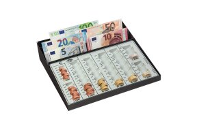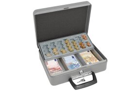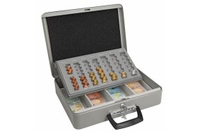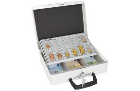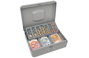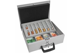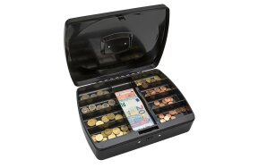 The cashbox for coins and banknotes is made of robust, powder-coated steel with matt, resistant surf...