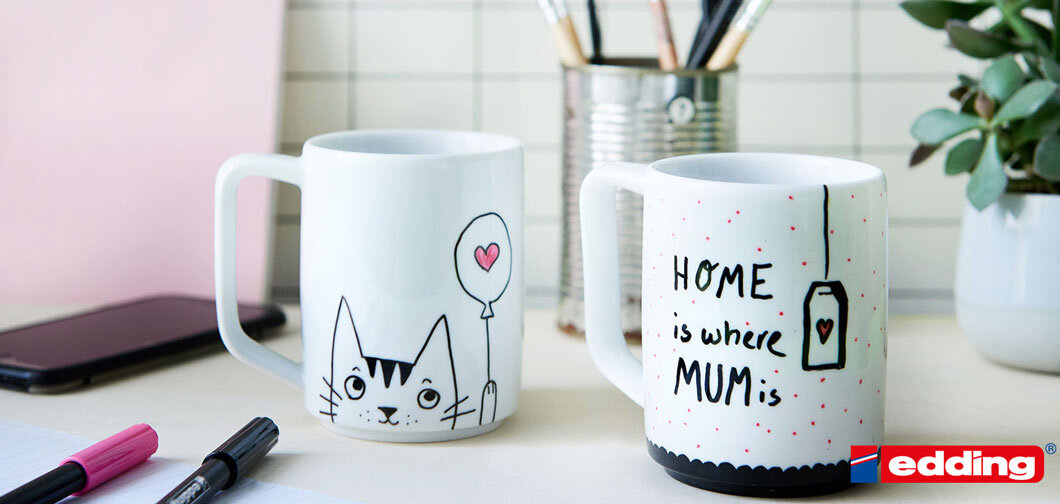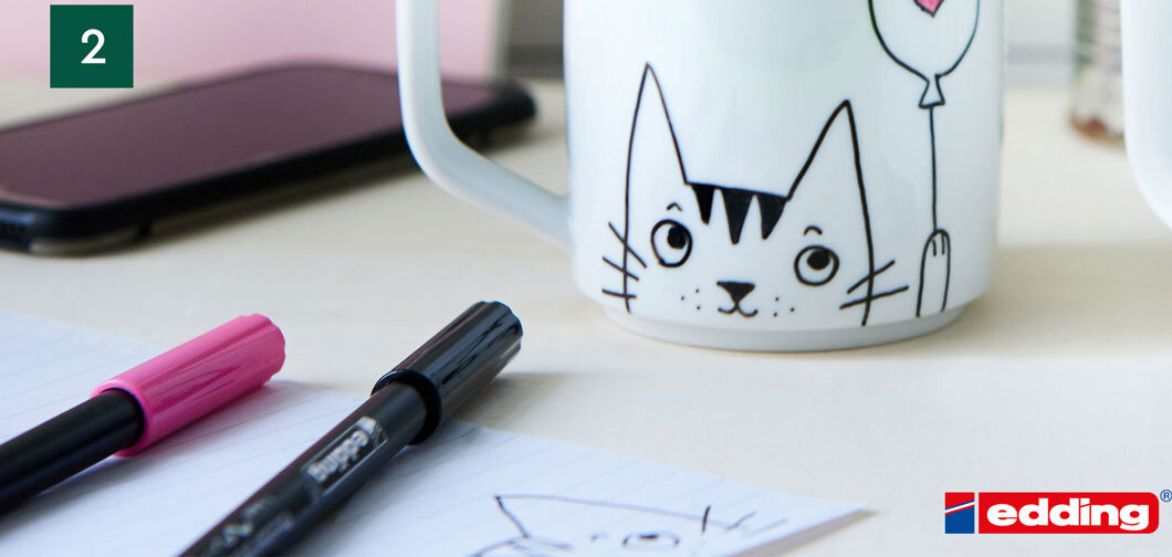 Μόλις η κούπα είναι τελείως στεγνή σχεδιάστε με τον μαρκαδόρο πορσελάνης edding 4200 απλά minimal σκίτσα με φαντασία και χιούμορ.