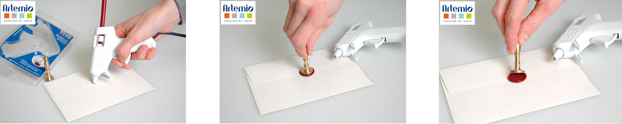 Εναλλακτικά για ακόμα πιο απλή και γρήγορη σφράγιση επιλέξτε να χρησιμοποιήσετε θερμικό πιστολάκι συνδυαστικά με χρωματιστές ράβδους βουλοκέρι