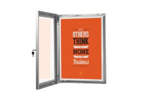Double-sided silver-coloured info display for posters in B2 portrait format with oval base.