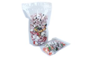 Frosted clear resealable stand up pouch ideal for olives, nuts, herbs, tea, coffee, legumes, spices,...