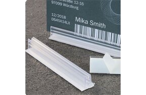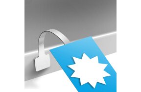 Shelf wobblers with 75 mm length made of aluminium for permanent attachment of printed products.