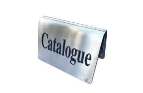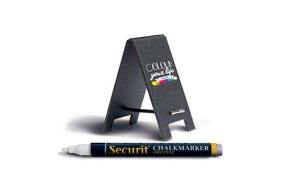 Table display for 3 bottles with chalk boar. Coated steel stand with a wooden framed writing surface...