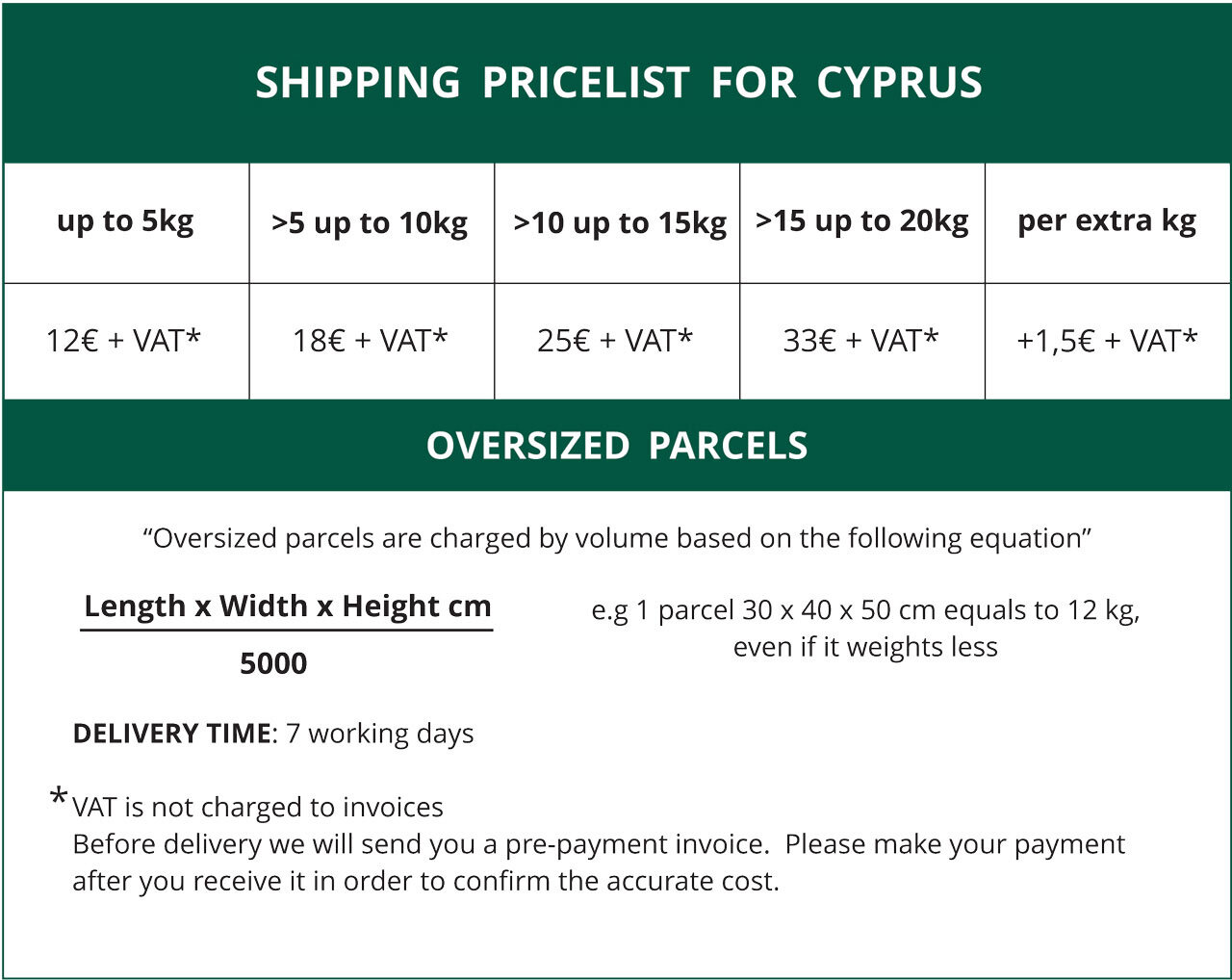 We cooperate with “Geniki Taxidromiki” or "ACS" courier for safe and fast deliveries. Shipping costs are charged to the recipient. Delivery cost for small size parcels up to 5kg is 4€+Vat for Greece and 12€ for Cyprus.