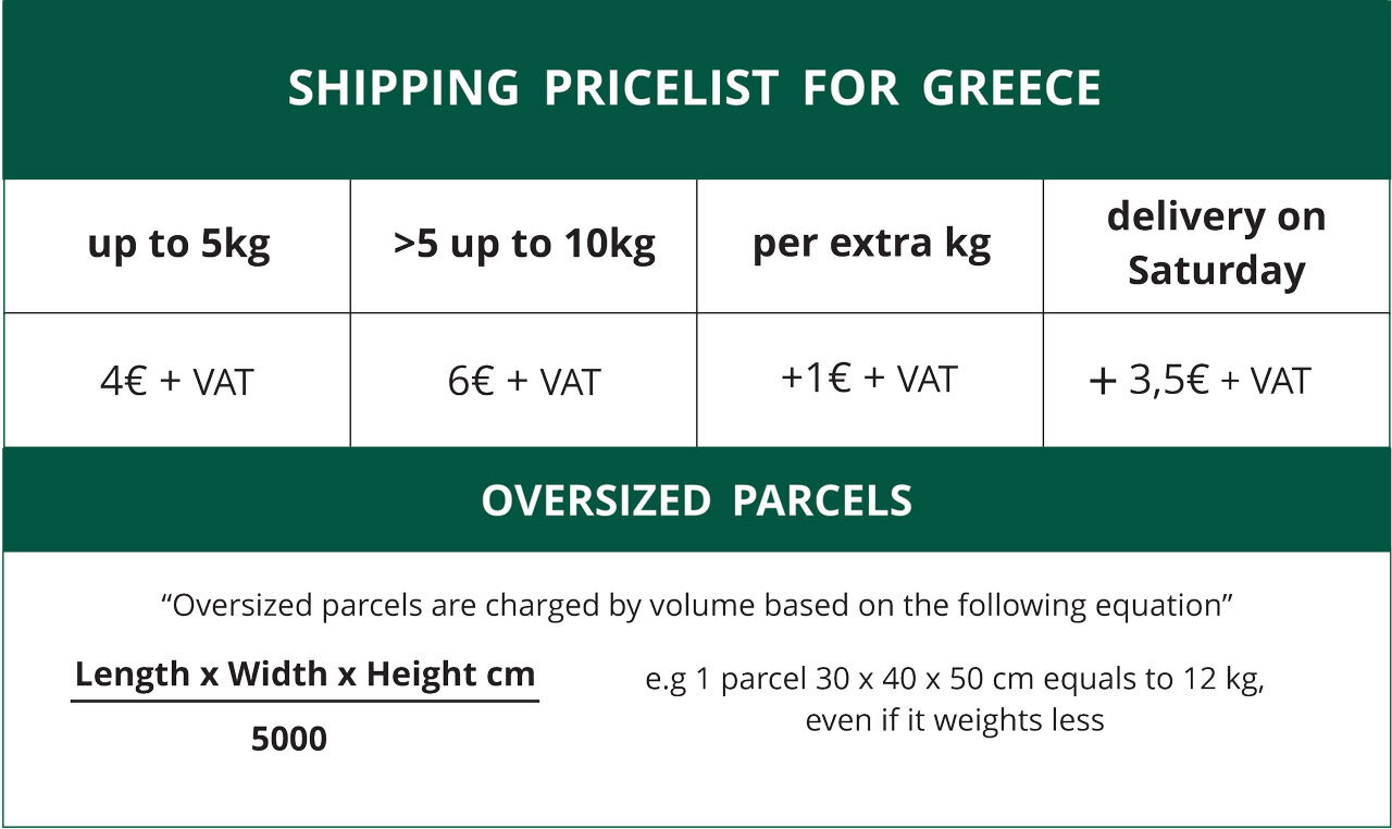 For heavy weight or oversized parcels we recommend shipping by carrier. We cooperate with carriers throughout Greece in order to deliver even to the most distant areas. We will contact you before shipping in order to inform you for the shipping cost. Shipping cost is charged to the recipient. Payment can’t be made upon delivery.